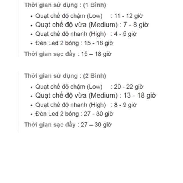 Quạt chế độ nhanh (High) : 8 - 9 giờ