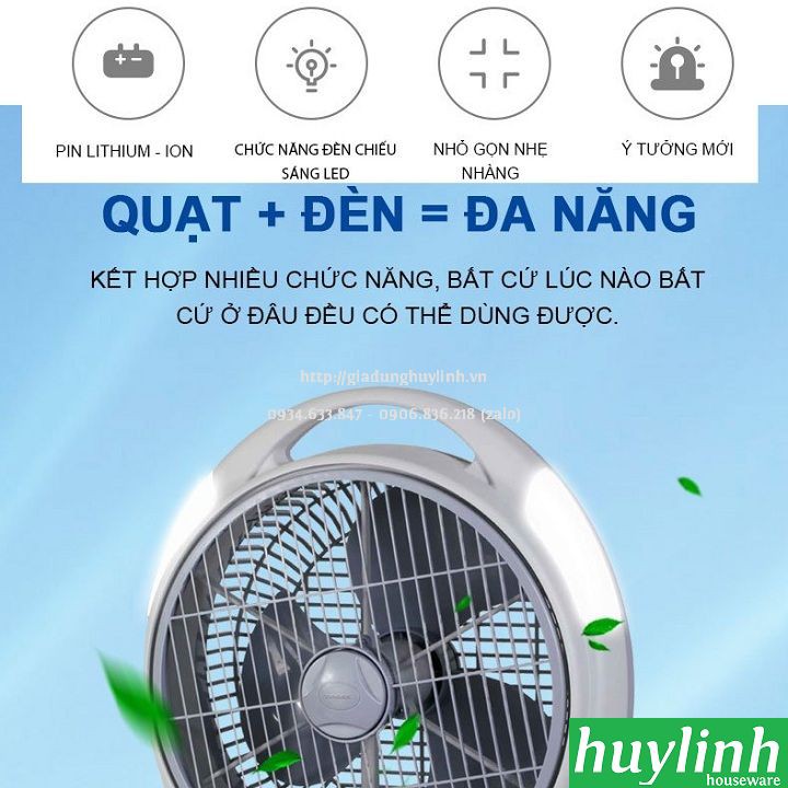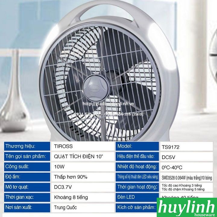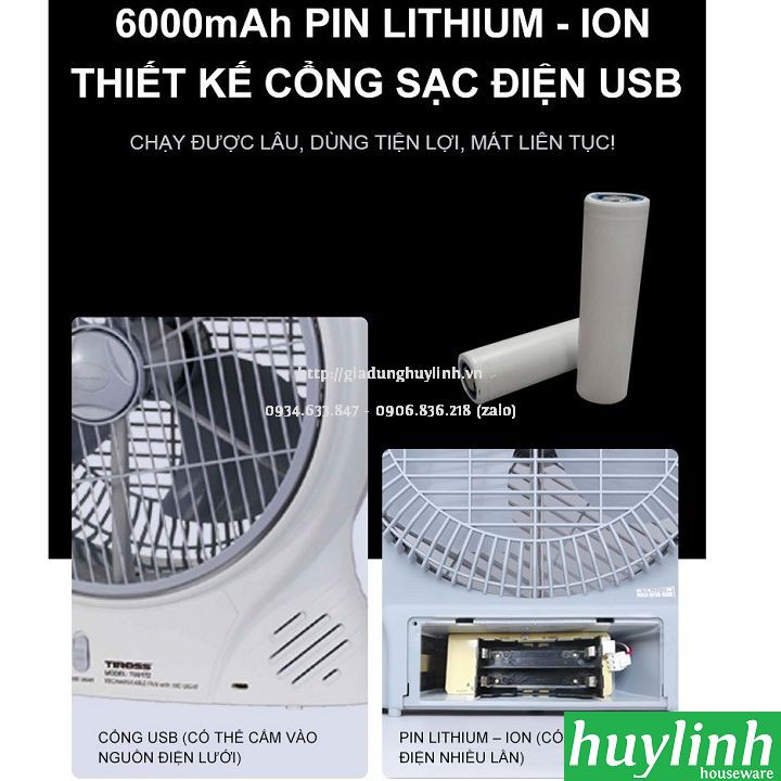 Quạt sạc tích điện Tiross TS9172 sử dụng pin sạc Lithium 6000mAh và kết hợp đèn led siêu sáng với khả năng hoạt động từ 3 - 5h.Huy Linh phân phối và bảo hành chính hãng tại Tiross Việt Nam