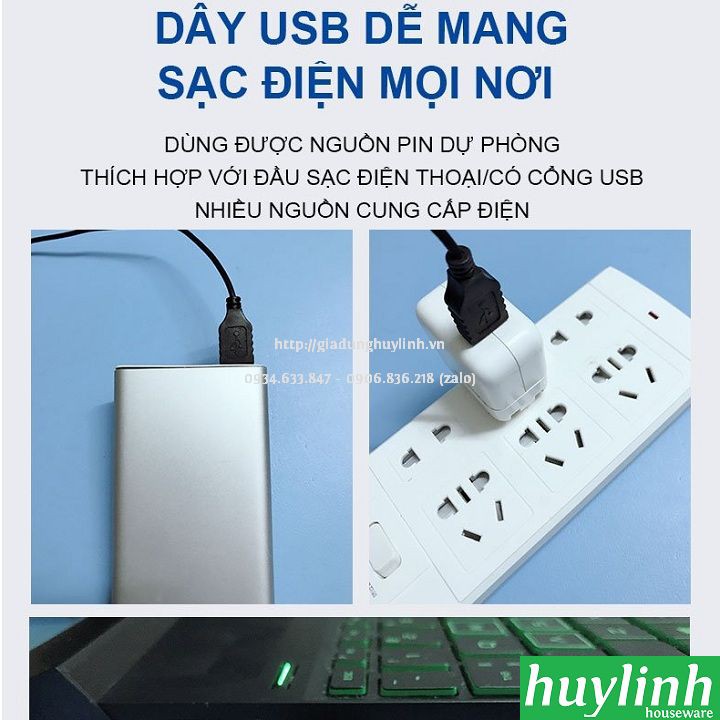 - Ưu điểm có thể dùng nguồn pin dự phòng hoặc từ máy tính cá nhân có dây USB đi cùng và chân sạc điện thoại cổng USB.