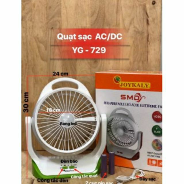 Quạt sạc tích hợp đèn led . YG-729Trong những ngày nóng bức, lại bị mất điện thì sẽ gây cho bạn và các thành viên trong gia đình sự khó chịu, nhưng khi bạn sở hữu chiếc Quạt sạc tích hợp đèn led Hongkong Technology YG-729 thì mọi việc sẽ được giải quyết, vì đây là một thiết bị được thiết kế giúp bạn và các thành viên trong gia đình có thể sinh hoạt bình thường khi bị mất điện. Ngoài một chiếc quạt với tốc độ quay mạnh tạo không khí mát mẻ còn có một dàn đèn led cho ánh sáng một vùng rộng và một đèn pin bóng lớn bên hông giúp bạn có thêm dụng cụ soi sáng khi di chuyển. Ngoài ra, với kiểu dáng gọn nhẹ, các thiết bị được tích hợp nhỏ gọn, tay xách tiện lợi là một dụng cụ hữu ích mà bạn nên có để chuẩn bị cho những ngày nóng bức và bị mất điện đột xuất.