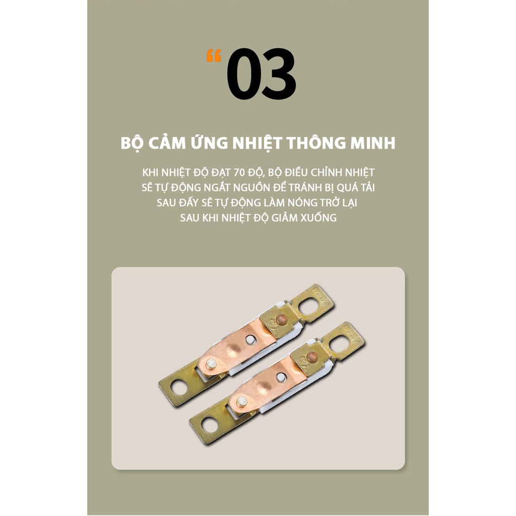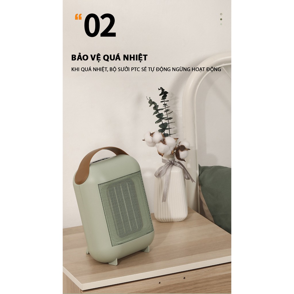 - Thiết kế bộ sưởi PTC tự động ngừng hoạt động khi bị quá nhiệt hoặc quạt bị nghiêng, đổ. Khi nhiệt độ đến 70 độ C, bộ điều chỉnh sẽ tự động ngắt nguồn để tránh bị quá tải; sau đấy sẽ tự động làm nóng trở lại sau khi nhiệt độ giảm xuống.