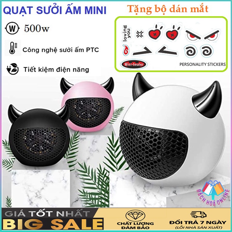 Quạt sưởi mini 2 chiều để bàn - Máy sưởi mini hình tiểu quỷ tinh nghịch công suất 500W - Tặng bộ gián Stiker