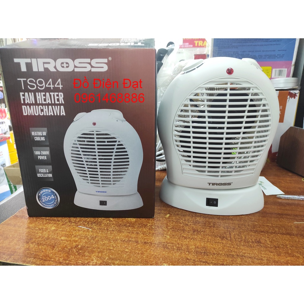 - Quạt sưởi Tiross TS944 hoạt động với công suất lên tới 2000W, điện áp 220V, phạm vi phát nhiệt rộng, có khả năng làm ấm nóng nhanh chóng cho những diện tích vừa phải, tiện dụng cho sưởi ấm các phòng nhỏ hoặc sưởi ấm trực tiếp gần cơ thể. Cũng có thể mang vào sưởi ấm trong phòng tắm hoặc sưởi ấm khi tắm cho trẻ sơ sinh.