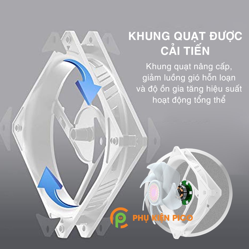 - SickleFlow 120 ARGB có 7 cánh quạt được cải tiến một cách tối ưu giúp cải thiện lưu lượng khí và áp suất không khí trong buồng máy
