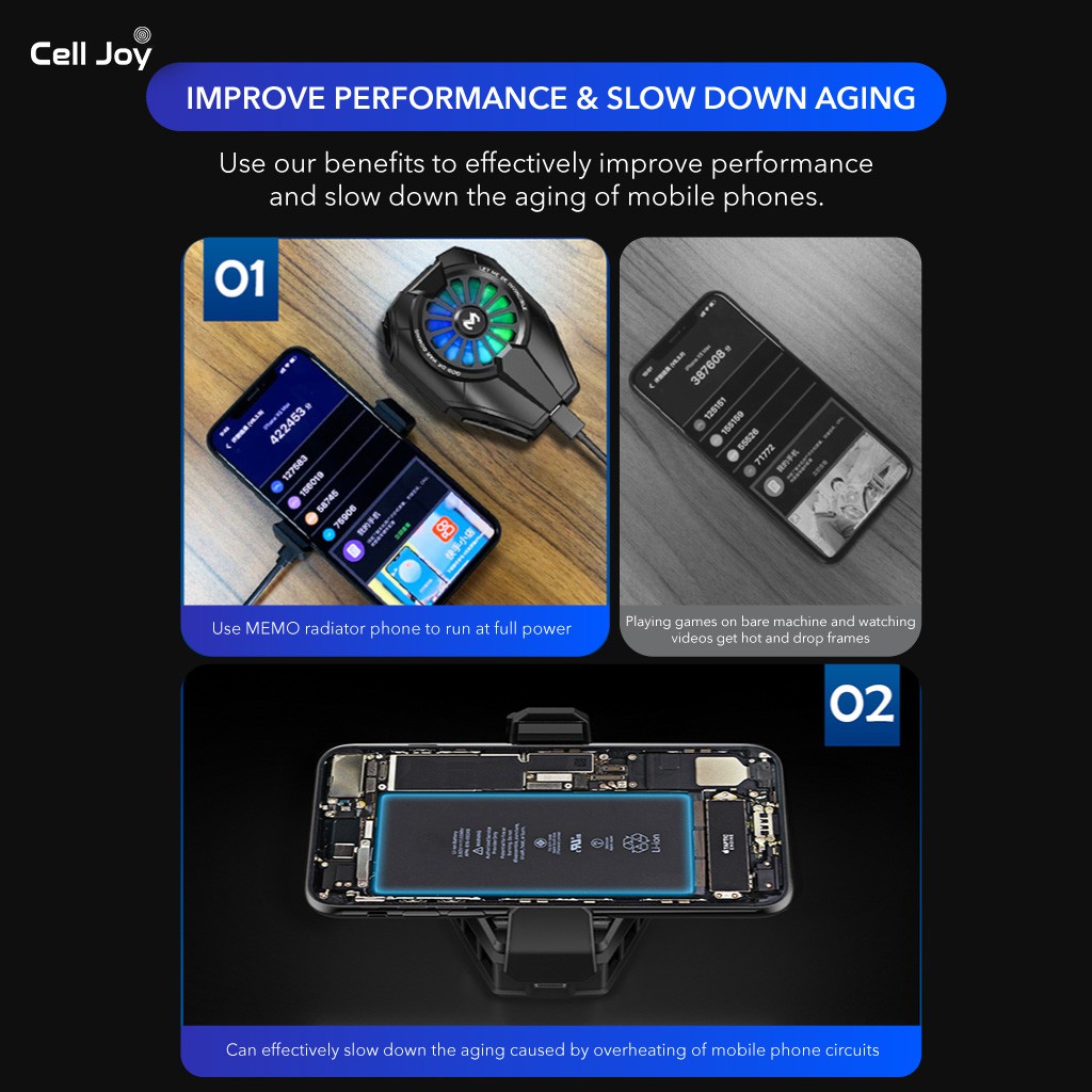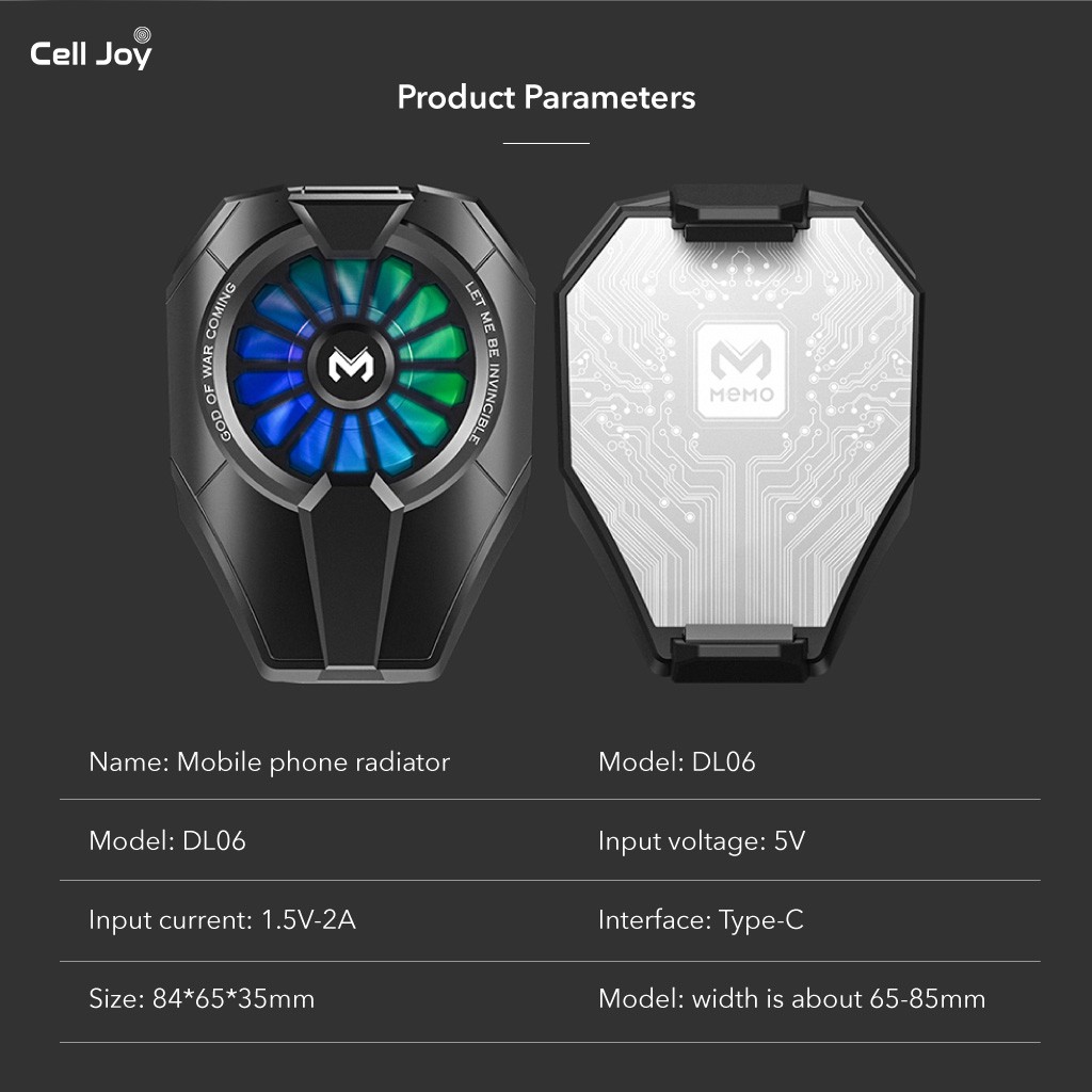 Tản nhiệt điện thoại iPhone, Android MEMO DL06 là một trong những dòng tản nhiệt mới nhất của hãng phụ kiện điện thoại MEMO - một thương hiệu chuyên về các dòng phụ kiện cho điện thoại chơi Game Mobile.MEMO DL06 vẫn kế thừa tất cả thiết kế và tính năng ổn định của các dòng sò lạnh cho điện thoại tiền nhiệm của MEMO Digital. Chỉ cải thiện hơn về mặt công suất và diện tích Pad lạnh tiếp xúc với điện thoại, để tăng hiệu năng làm mát cho điện thoại.