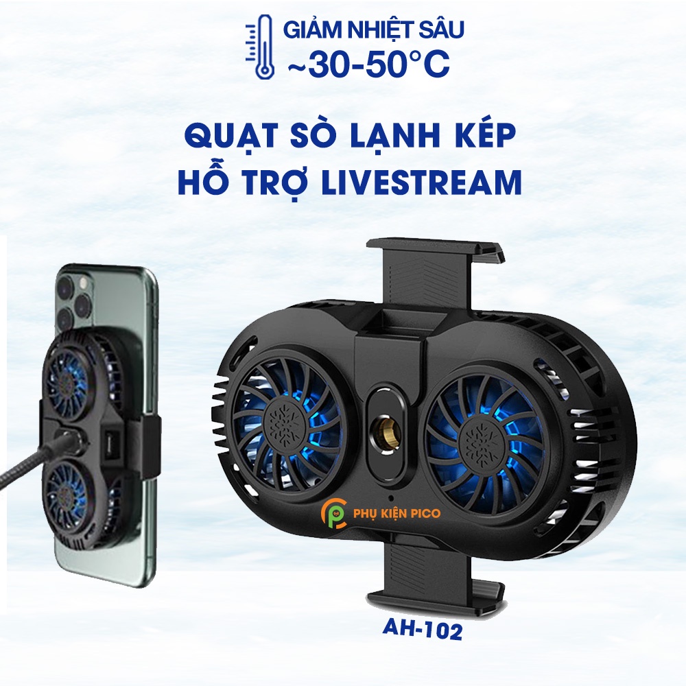 Quạt tản nhiệt điện thoại sò lạnh kép AH102, Kẹp điện thoại tản nhiệt chơi game Livestream, hỗ trợ chân đế giá đỡ Livestream, Quay video tiktok thời gian dài không lo nóng máy hại pinQuạt tản nhiệt điện thoại AH 102 Trang bị 2 sò lạnh trong thân quạt giúp làm lạnh cực mạnh và lạnh sâu. Phụ kiện không thể thiếu của các Streamer Tiktoker chuyên nghiệp, giúp điện thoại không bị nóng lên khi chơi game hoặc livestream hoặc quay video tiktok thời gian dài, giúp kéo dài tuổi thọ của pin, cũng như các linh kiện của máy (như màn hình, camera, vi xử lý, loa...).