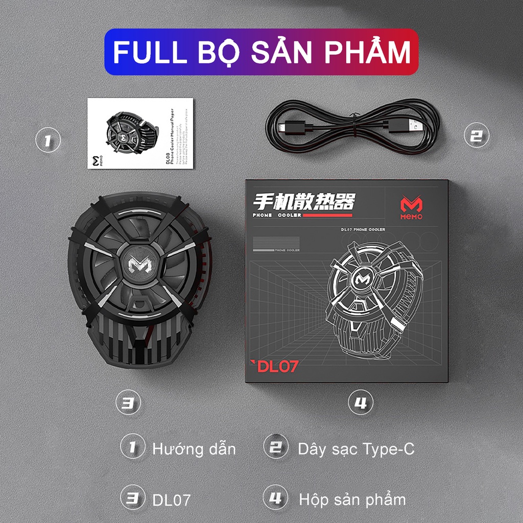 Quạt tản nhiệt điên thoại MEMO DL07 Sò lạnh led rgb đổi màu gaming quạt chống ồn chơi game pubg ff liên quân mobile