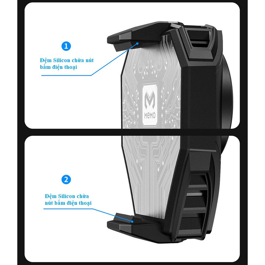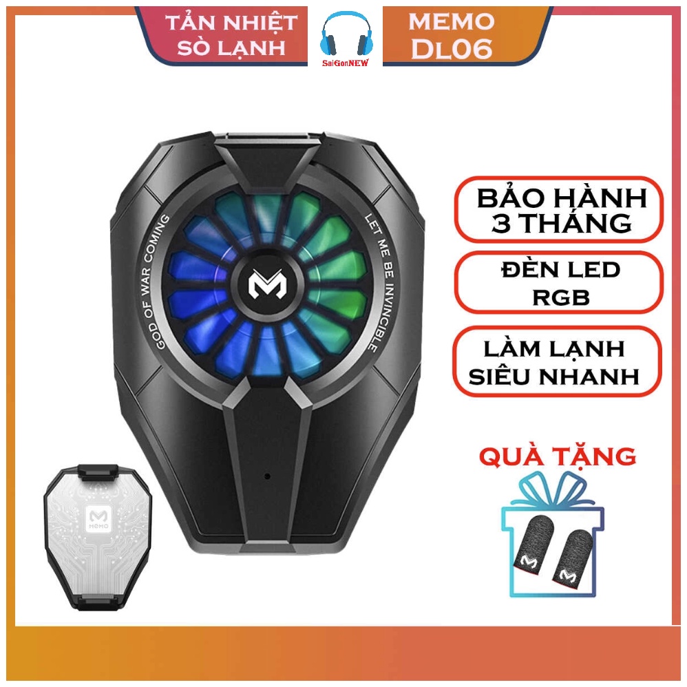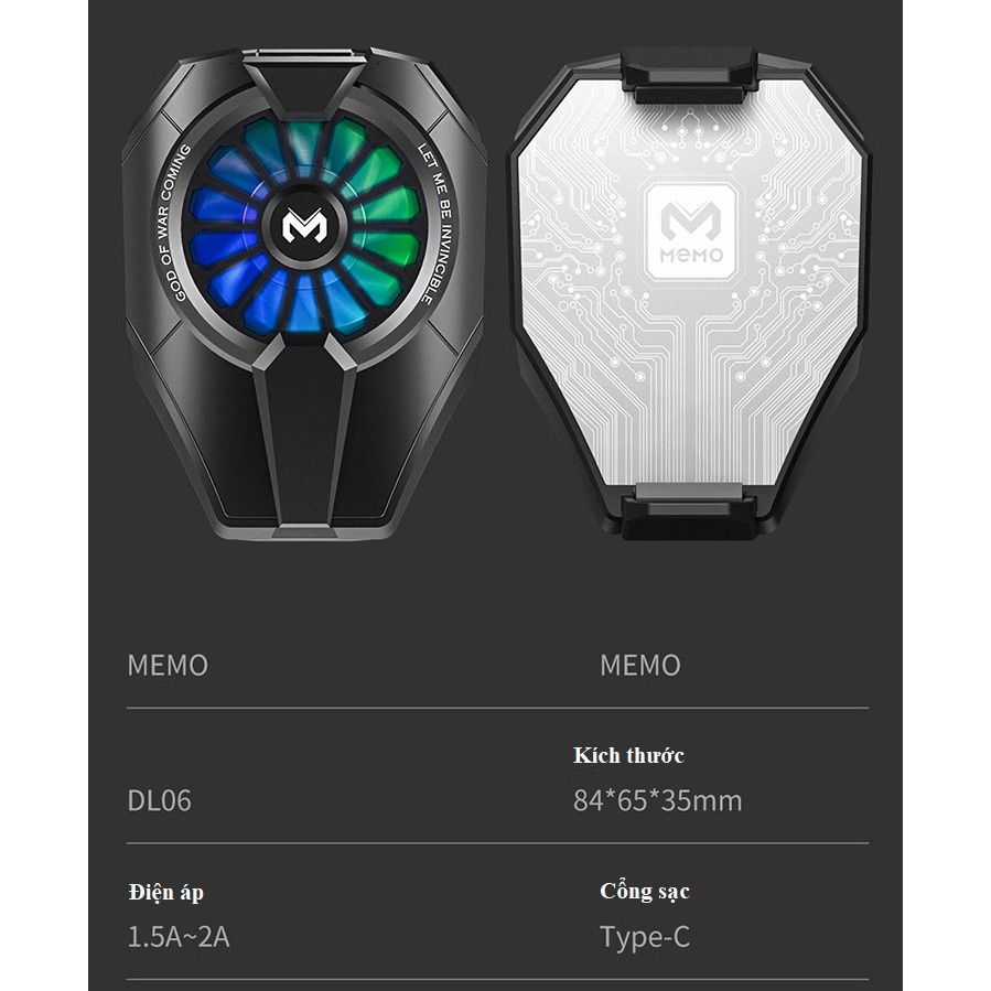 - QUẠT TẢN NHIỆT ĐIỆN THOẠI MEMO DL06 là mẫu mới ra mắt năm 2021, được trang bị thêm đèn led RGB, Ngoài ra QUẠT TẢN NHIỆT CHO ĐIỆN THOẠI MEMO DL06 được thiết kế lại với miếng tản nhiệt lớn hơn so với các mẫu quạt tản nhiệt trên thị trường