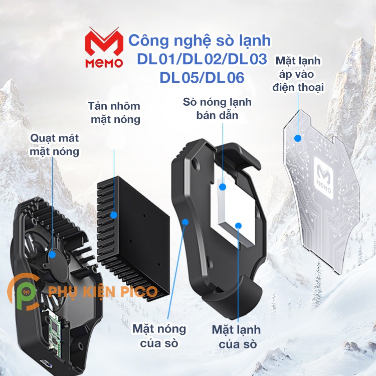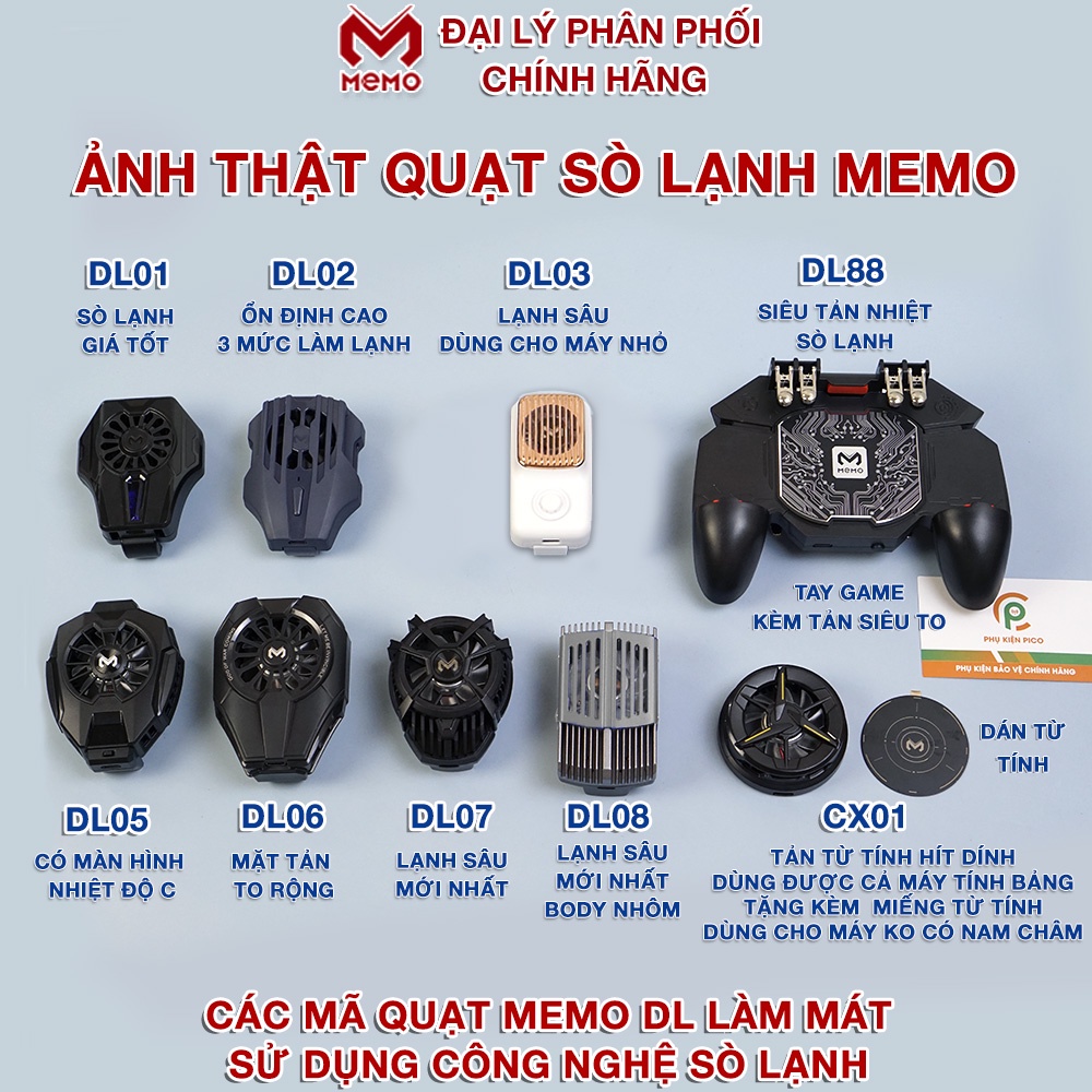 Dòng quạt sò lạnh Memo DL01 | Memo DL02 | Memo DL03 | Memo DL05 | Memo DL06 | DL07 | DL08 | X3A Pro là dòng quạt tản nhiệt điện thoại sử dụng công nghệ sò lạnh bán dẫn để làm mát như cây nước nóng lạnh.Dòng quạt sò lạnh X3A Pro có pin sạc 2000mAh mới nhất không cần cắm dây vẫn chơi game được 2-3 tiếng.