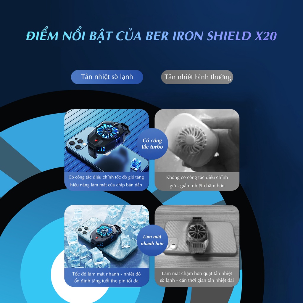 Quạt tản nhiệt điện thoại BER IRON SHIELD chơi game sò lạnh X20 - DỤNG CỤ HỖ TRỢ ĐẮC LỰC CHO CÁC GAME THỦ