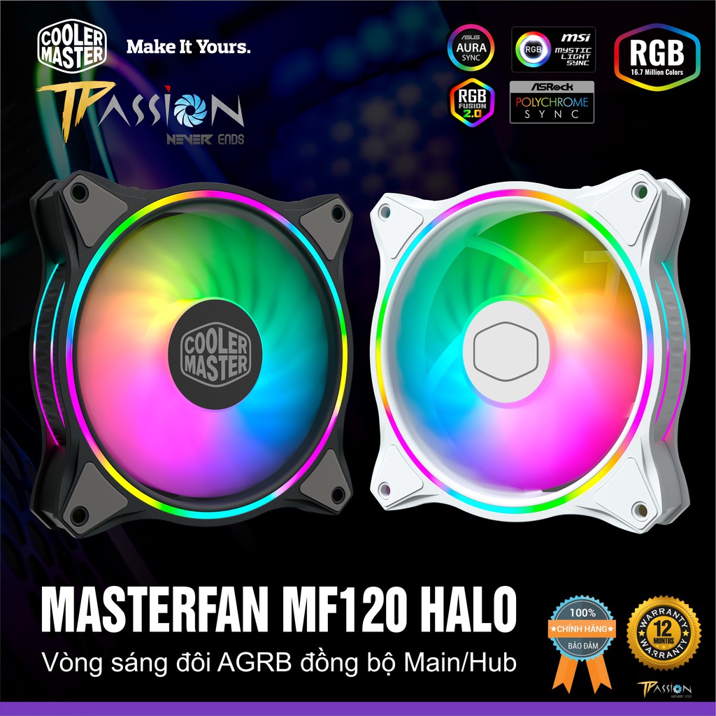 Máy tính & Laptop > Linh Kiện Máy Tính > Quạt và Tản Nhiệt || Quạt tản nhiệt fan case 12cm Cooler Master MasterFan MF120 HALO - LED Rainbow Argb 2 vòng ring cực đẹp, hiệu năng caoCòn hàng