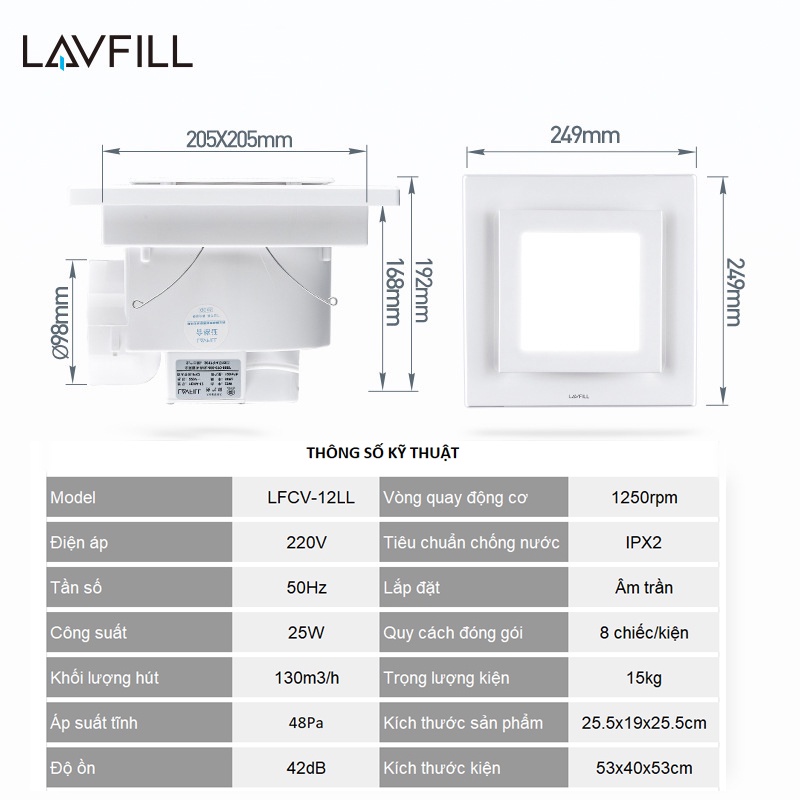Giới thiệu Quạt thông gió hút mùi âm trần với đèn LED vuông, độ ồn nhỏ, hút khỏe với bề mặt 250x250mm LAVFILL LFCV-12LL