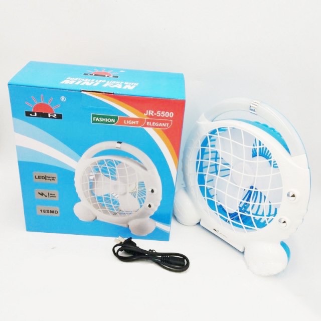Quạt sạc điện kiêm đèn pin Mini Fan JR-5500– Quạt sạc kiêm đèn sạc đa chức năng JR5500 vừa có chức năng quạt mát với 2 tốc độ gió, vừa có chức năng đèn thắp sáng với 2 chế độ sáng.