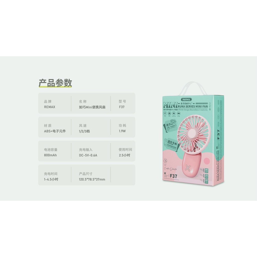 QUẠT CẦM TAY REMAX F37Quạt Remax F37 được thiết kế nhỏ xinh với mầu sắc tươi trẻ và năng động, các bạn có thể cầm đi mọi lúc mọi nơi.