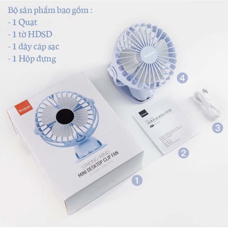 Giới thiệu Quạt tích điện Yoobao 6400MAH, quạt mini cầm tay 4 cấp độ gió, xoay 720 độ, đế kẹp đa năng tiện lợi