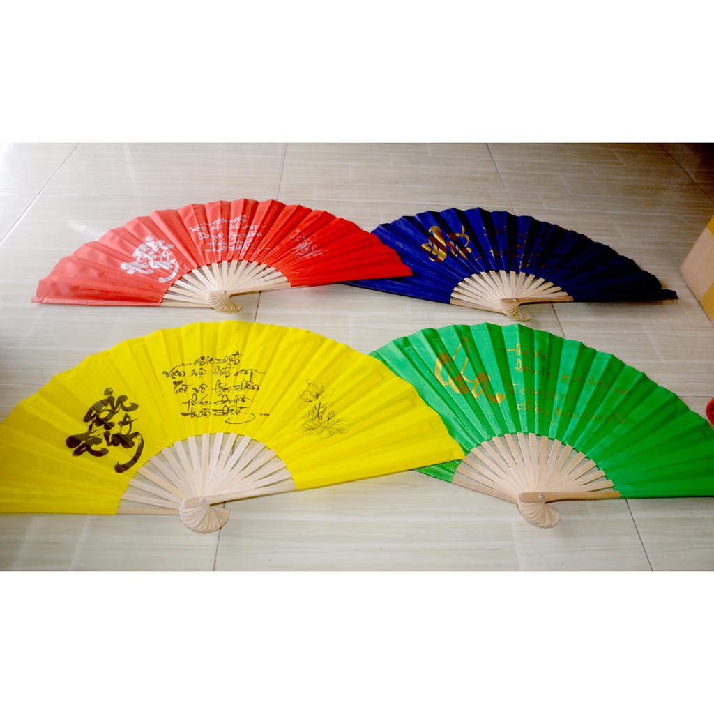 Quạt vải nhiều màu,viết chữ thư phápChất liệu:vải,tre