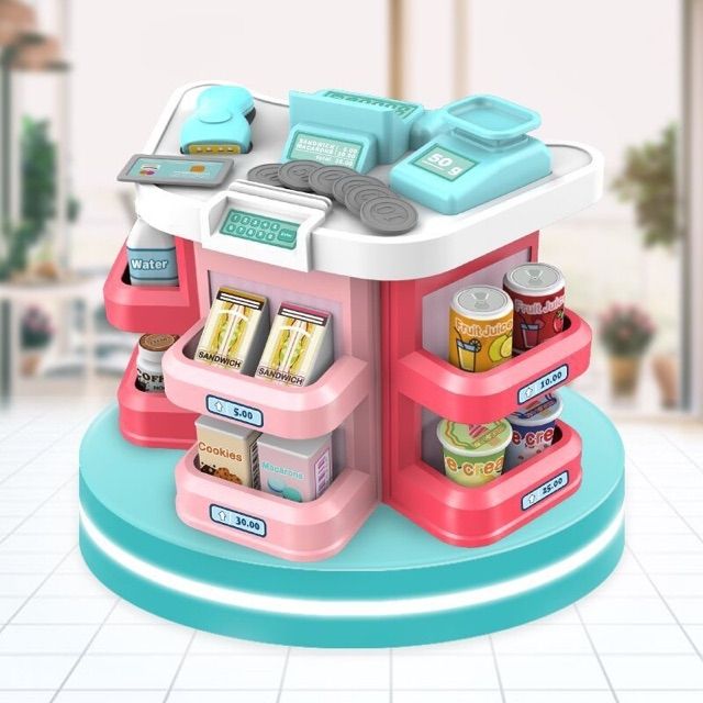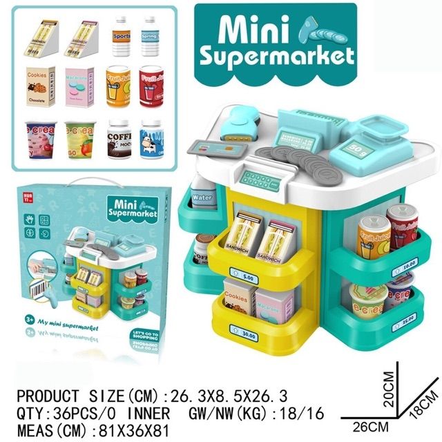 Mô phỏng một quầy siêu thị bán hàng nho nhỏ☆Kích thước 26x20x18cm cùng những phụ kiện kèm theo như lon nước, hộp bánh, tiền xu, máy tính tiền. ☆Bé sẽ được đóng vai làm bà chủ nhỏ với quầy bán hàng của riêng mình