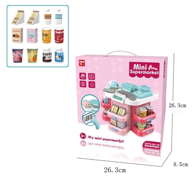Mô phỏng một quầy siêu thị bán hàng nho nhỏKích thước 26x20x18cm cùng những phụ kiện kèm theo như lon nước, hộp bánh, tiền xu, máy tính tiền.