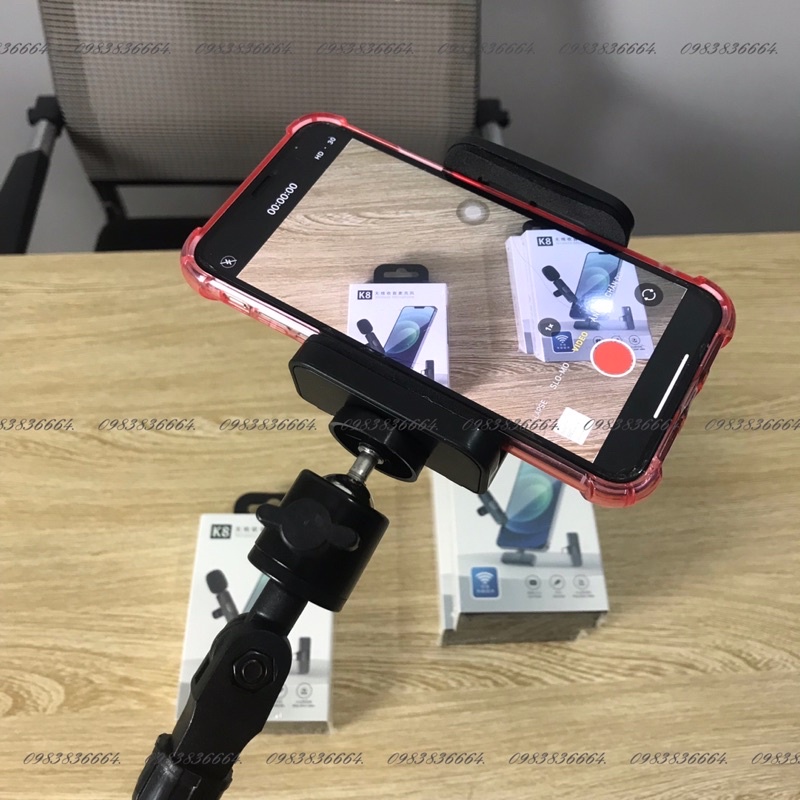 + phần đầu kẹp điện thoại có thể xoay 360 độ, giúp tạo được nhiều góc máy quay