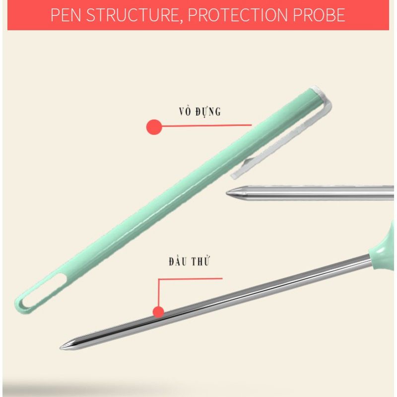➖ Đầu thử bằng inox 304, không gỉ, dẫn nhiệt tốt, thân nhiệt kế bằng nhựa ABS.