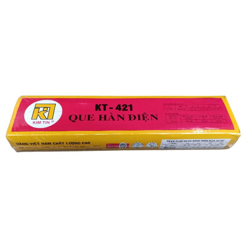 Que hàn sắt Kim Tín KT-421 là vật liệu kết dính sắt rất tốt, được sản xuất tại Việt Nam, Que hàn KT-421 có đường hàn tuyệt đẹp, mới hàn bền chắc, năng suất hoạt động cao, giúp cho mối hàn nhuyễn và đẹp, láng, dễ bong xỉ, nhẹ điện, ít khói và bắn toé, có thể hàn được ở mọi vị trí.Dùng cho mối hàn thép cacbon và thép hợp kim thấp, có tải trọng trung bình.