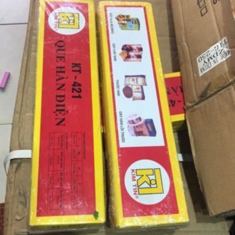 Que Hàn Kim Tín Chất Lượng Cao KT-421 Phi 2.5mm x 300mm Chính HãngQue hàn thường (sắt) Kim Tín KT-421 là vật liệu kết dính sắt rất tốt, được sản xuất tại Việt Nam, Que hàn KT-421 có đường hàn tuyệt đẹp, mới hàn bền chắc, năng suất hoạt động cao, giúp cho mối hàn nhuyễn và đẹp, láng, dễ bong xỉ, nhẹ điện, ít khói và bắn toé. Có thể hàn được ở mọi vị trí. Dùng cho mối hàn thép cacbon và thép hợp kim thấp, có tải trọng trung bình.