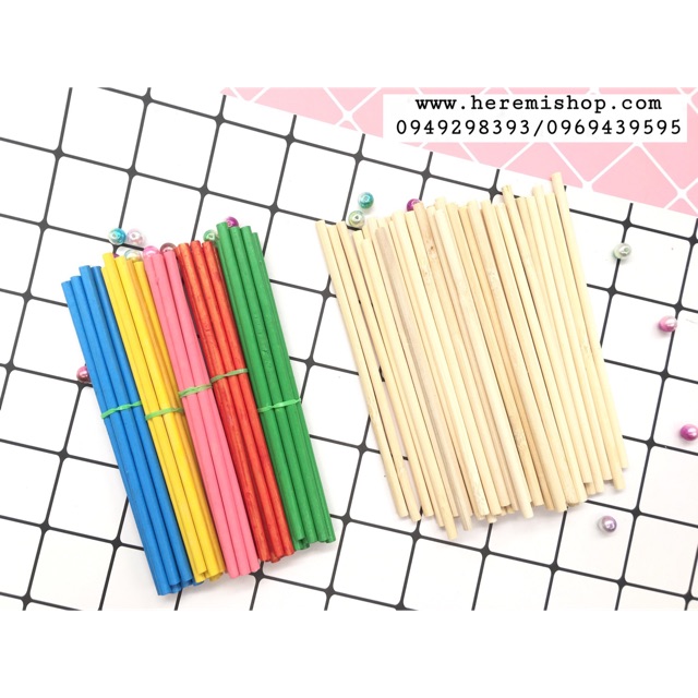 Que thân tròn dài 13,5cm, đường kính que 0.5cm.Hiện bên tớ sẵn 2 loại là màu gỗ và nhiều màu.