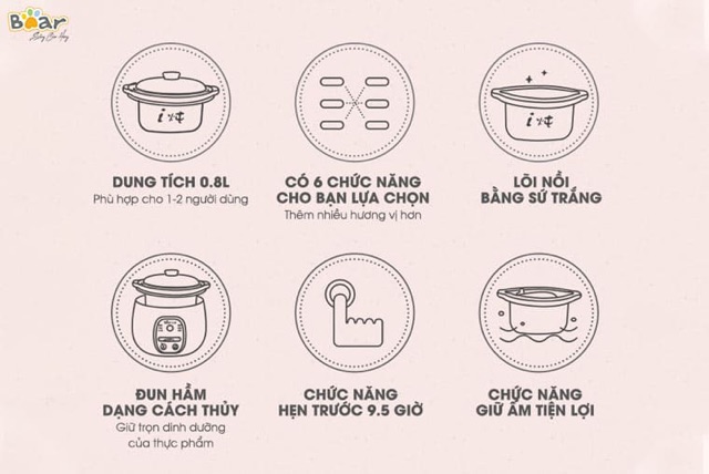Nồi cách thuỷ Bear có 6 chế độ nấu phù hợp cho hầu hết các nhu cầu của các gia đình, đặc biệt phù hợp để làm các món ăn dặm vừa an toàn lại vừa đủ chất cho bé. Sản phẩm được bảo hành 1 tháng tại Kubinstore.Đặc biệt hơn nồi vừa có thể nấu cháo vừa hấp củ quả, khoai trứng, các loại bánh...rất tiện dụng cho cho gia đình, đặc biệt là mẹ bầu và bé cần tẩm bổ, bé ăn dặm mẹ nhàn tênh ạ!