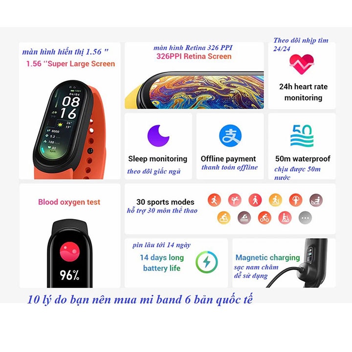 [Bản quốc tế] Đồng Hồ Thông Minh Xiaomi Mi Band 6 smart watch đo nồng độ oxy trong máu SpO2