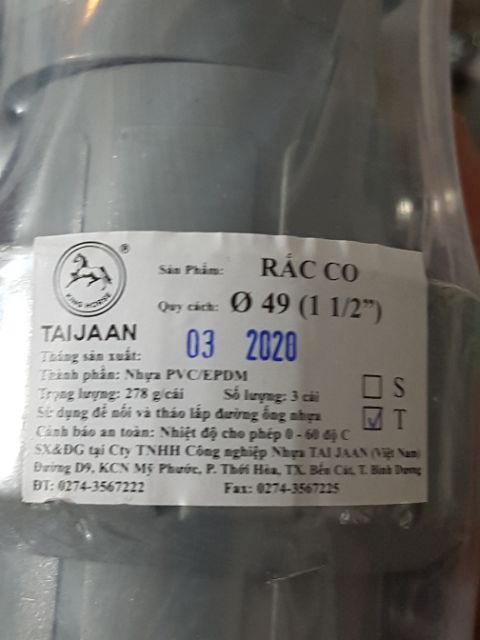 Nhà cửa & Đời sống > Dụng cụ & Thiết bị tiện ích > Máy bơm nước & phụ kiện || Rắc co , máy bơm nước Taijan , Taida bằng nhựa ABS đường kính 42 , 48 , 60Còn hàng