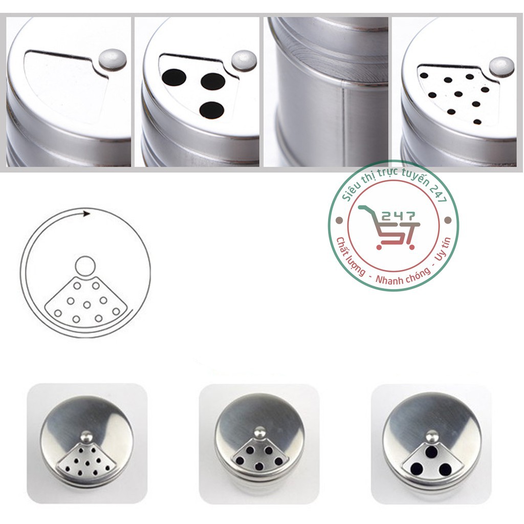 - Thiết kế đa lỗ xoay cho phép bạn lựa chọn 3 kích thước trên đầu hũ rắc để phân phối các loại gia vị khác nhau theo ý muốn, bạn có thể xoay nó để hũ được đống lại hoàn toàn để giữ được độ tươi của gia vị.