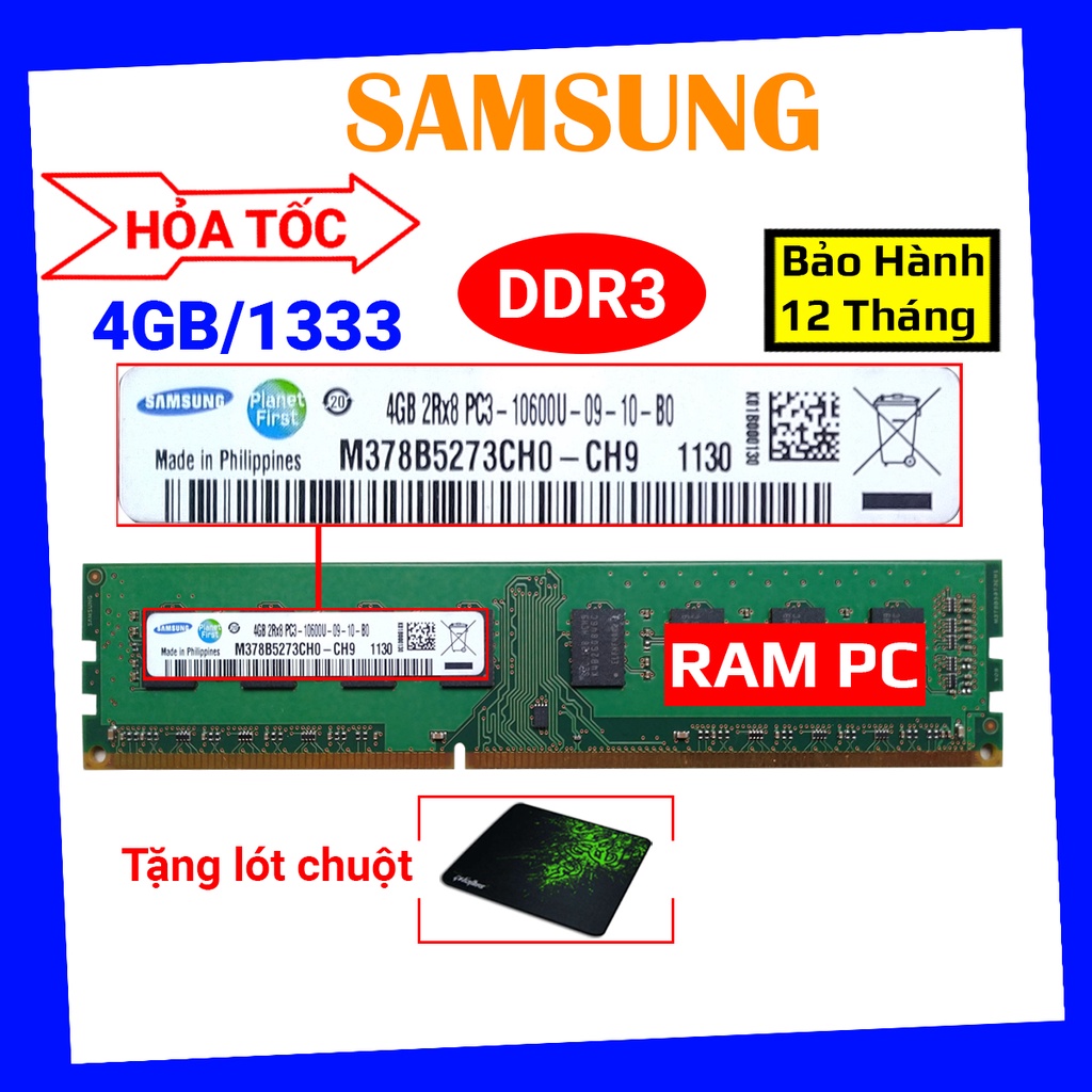 Giới thiệu ram ddr3 4gb bus 1333 - 16 chip lắp main g41 h61 b75 h81 b85 chính hãng samsung pc3 10600u bảo hành 12 tháng