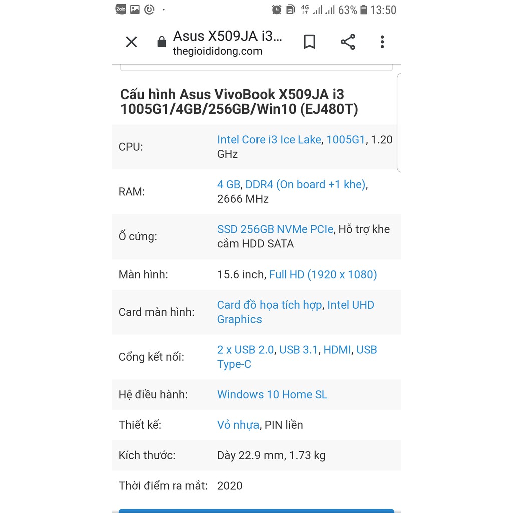** CÁCH 4: Đối với các laptop có ram liền bo không thể tháo rời các cách trên sẽ không sử dụng được, khi đó CPU-Z chọn cả Slot #1 và Slot #2 đều không thấy thông số ram. Ta vào Google tra tên dòng máy, tìm link của Thegioididong để xem thông tin ram, ví dụ tra “laptop Asus X509JA” ra kết quả như trên hình. Cách này có thể áp dụng cho mọi máy, tuy nhiên tháo ram ra xem vẫn là cách tốt nhất, chọn ram giống thông số cây đang sử dụng là chắc ăn nhất.