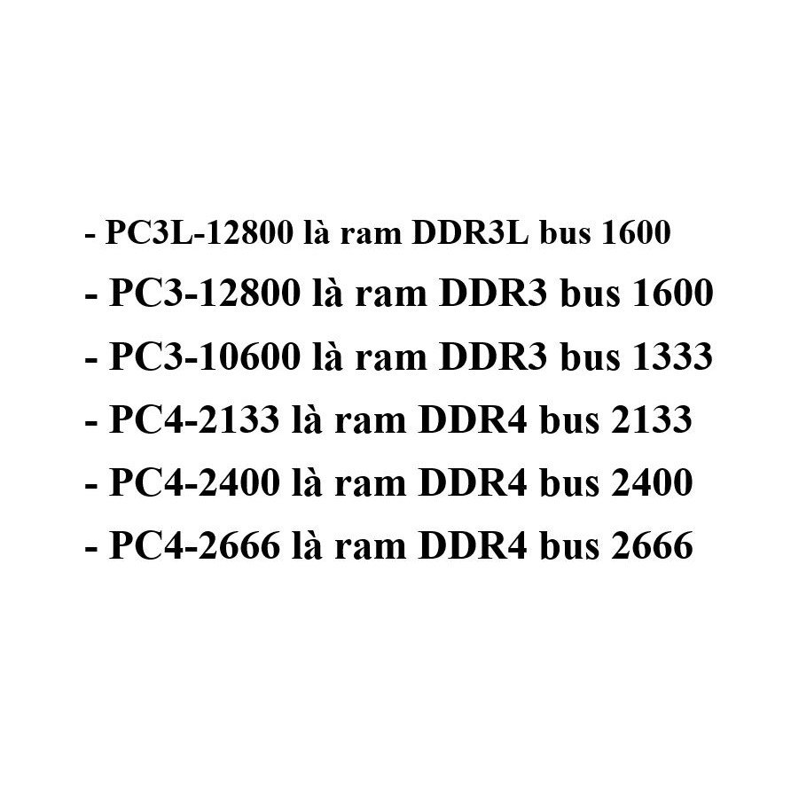 - PC3L (DDR3L) dùng cho dòng máy core i thế hệ thứ 3, 4, 5, 6.