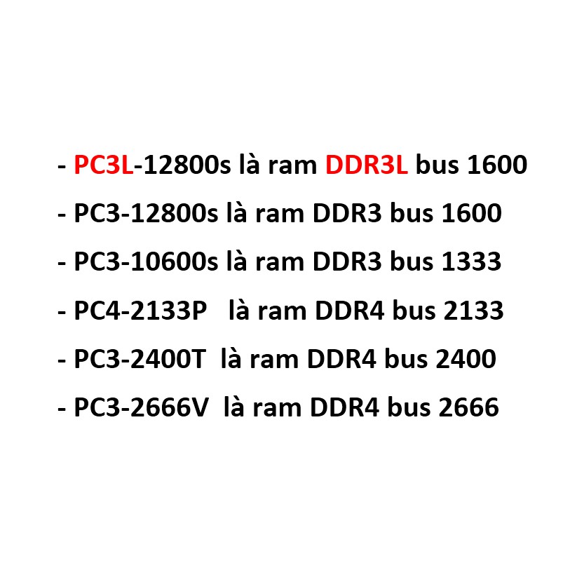 - PC3L (DDR3L) dùng cho dòng LAPTOP core i thế hệ thứ 3, thứ 4, thứ 5, thứ 6.
