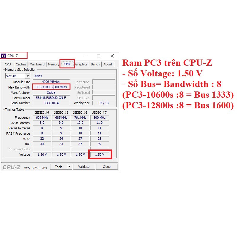 - Số Bus Ram = Bandwidth chia 8 ví dụ PC3-10600s tức là Ram Bus 1333 (10600 : 8), PC3- 12800s tức là Ram Bus 1600 (12800:8)