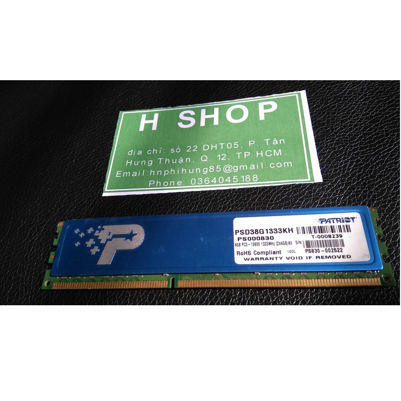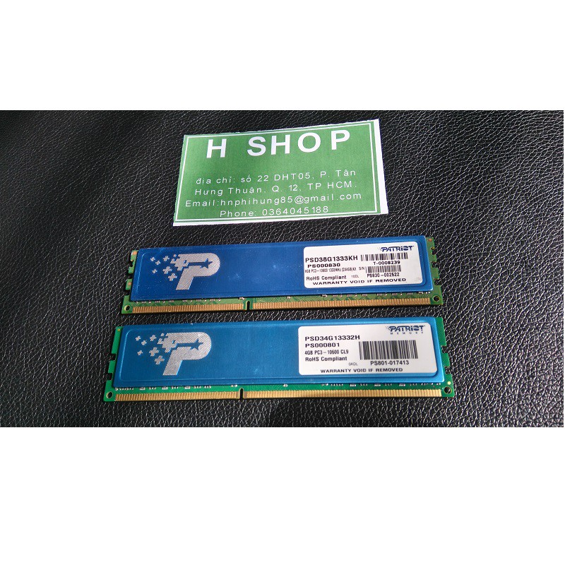 H SHOP cung cấp sản phẩm ram PC DDR3 4Gb bus 1333 - 10600u, Ram bộ hiệu Patriot chính hãng , tháo từ máy bộ được bảo hành 1 đổi 1 trong suốt 3 năm sử dụng nếu bị lỗi.