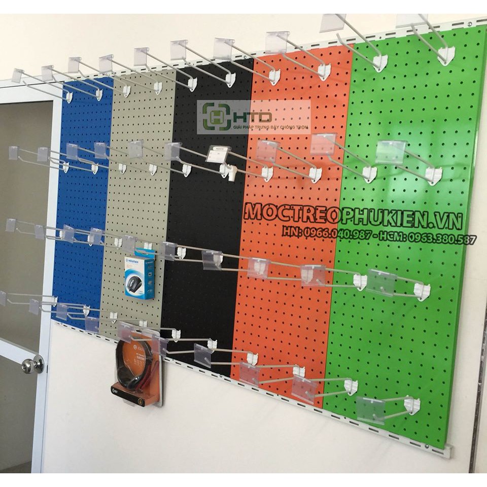 Dùng cài tấm thép đột lỗ treo phụ kiện HTD-TL001 và móc bi treo quần áo cài ray đôi E02