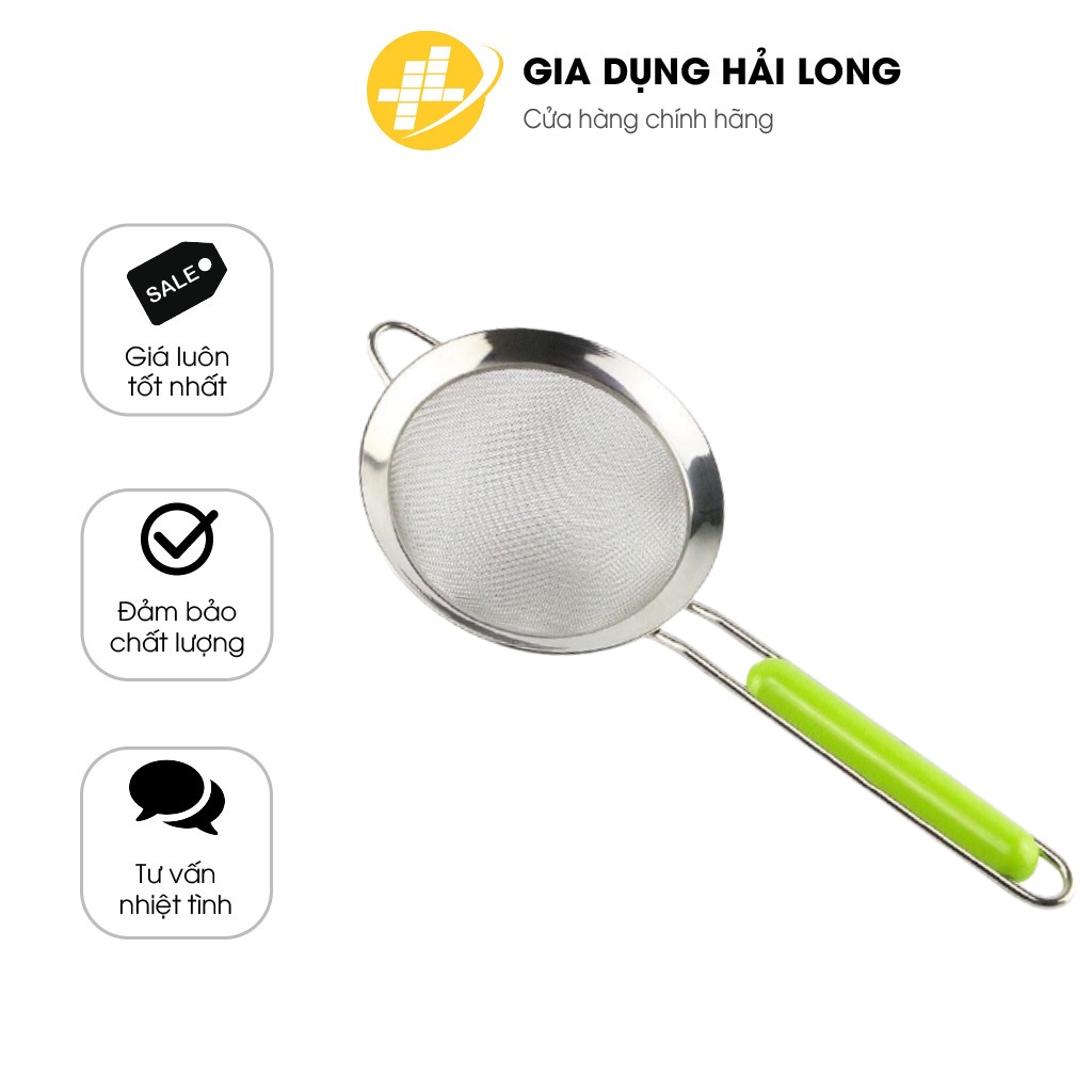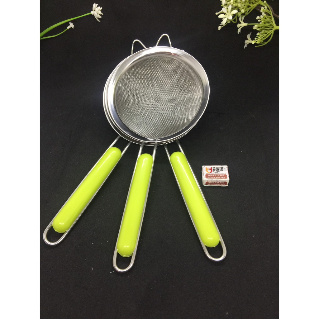 Rây lọc inox siêu mịn. Rây lọc cháo 1 lớp cán nhựa xanh inox 304 không rỉ.- Công cụ tương trợ đắc lực cho bà nội trợ trong việc rây bột, lược cặn trong chất lỏng, làm cho ráo thực phẩm sau khi rán, luộc...