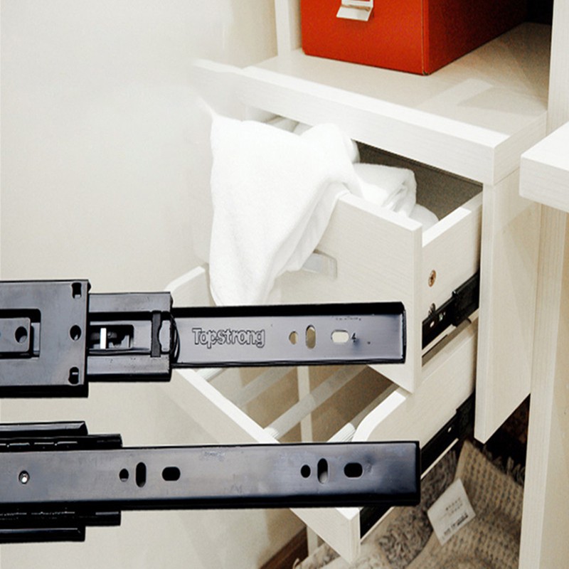 - RAY TRƯỢT BI BA TẦNG: Gồm 3 thanh mảnh được xếp chồng lên nhau, liên kết bởi 1-2 lớp bi nhỏ, được bôi trơn bằng một tinh dầu đặc biêt nhằm chuyển động nhẹ nhàng. Chất liệu thông thường của ray trượt thường là bằng THÉP. RAY TRƯỢT BI BA TẦNG này khi gắn vào hộc tủ sẽ mở 100% chiều dài.