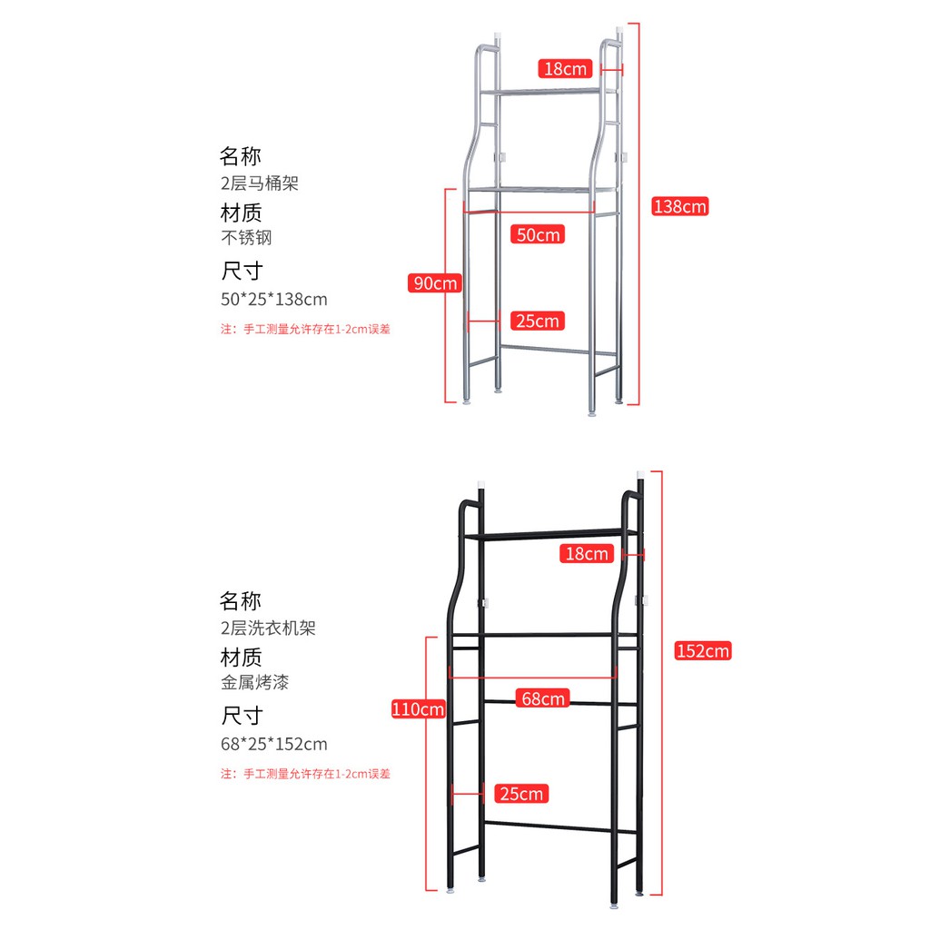 - Kích thước: Kệ máy giặt 3 tầng 68x25x110cm; Kệ bồn cầu 3 tầng 50x25x160cm.
