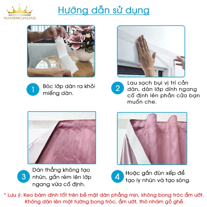 Lưu ý: Có thể dùng 2 rèm dán cho 1 cửa để tạo sóng và kéo sang 2 bên sẽ đẹp và sang trọng hơn, nên chọn chiều ngang rèm dài hơn cửa để rèm che hết cửa và tạo độ xếp ly.