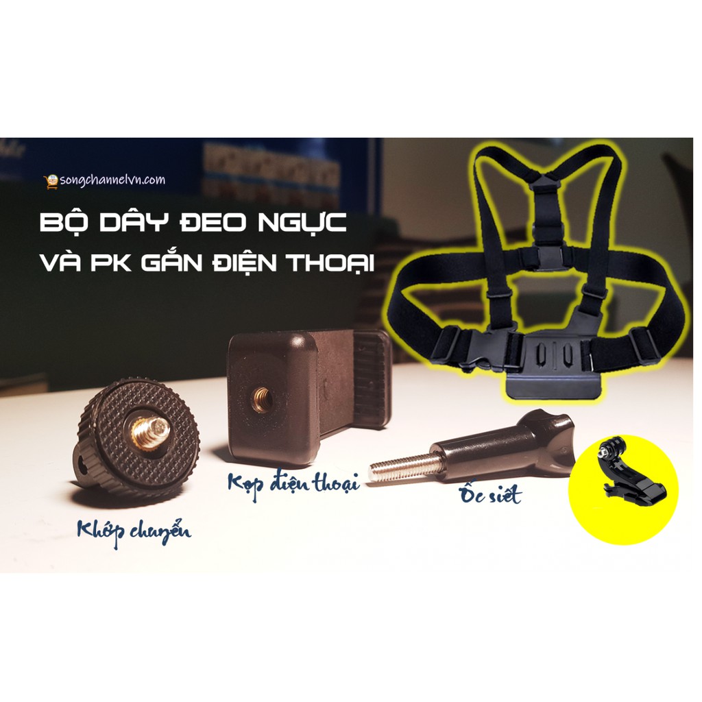 3 Dây đeo ngực full PK : (Dây đeo ngực, mount chữ J, khớp chuyển, ốc siết, kẹp điện thoại): Gắn được cả Điện Thoại cả Camera Hành Động