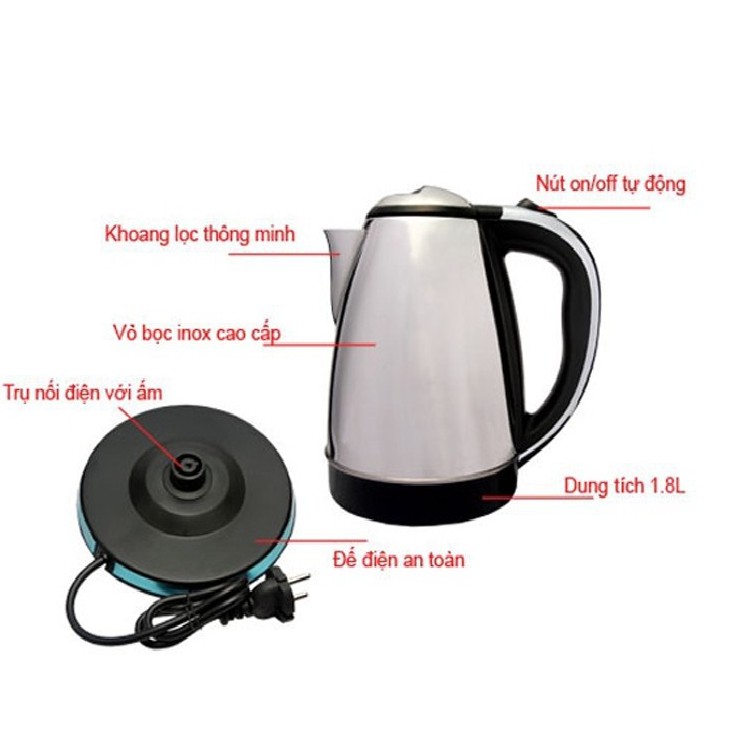 🔹 Thể tích 1,8 lít, cho bạn thoải mái đun nước pha trà, pha cà phê, nấu mỳ gói, pha nước tắm…🔹 Ấm đun làm từ chất liệu inox bền đẹp, không độc hại, tốt cho sức khỏe người sử dụng.