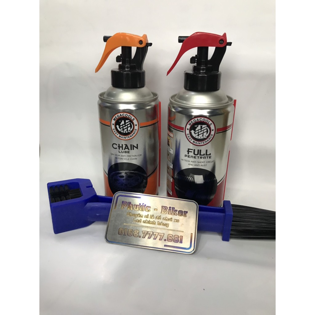 Giới thiệu [Rẻ Vô Địch] Combo xịt sên, rửa sên Megacools Chainlube và FULL PENETRATE 300ml tặng bàn chải chà sên . DoChoiXeMay