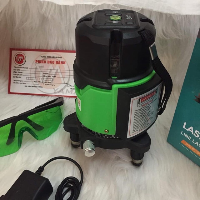 Đầu ra tia laser màu xanh 4 tia ngang, 1 tia dọc vuông góc nhau, 1 chấm laser dọi xuống