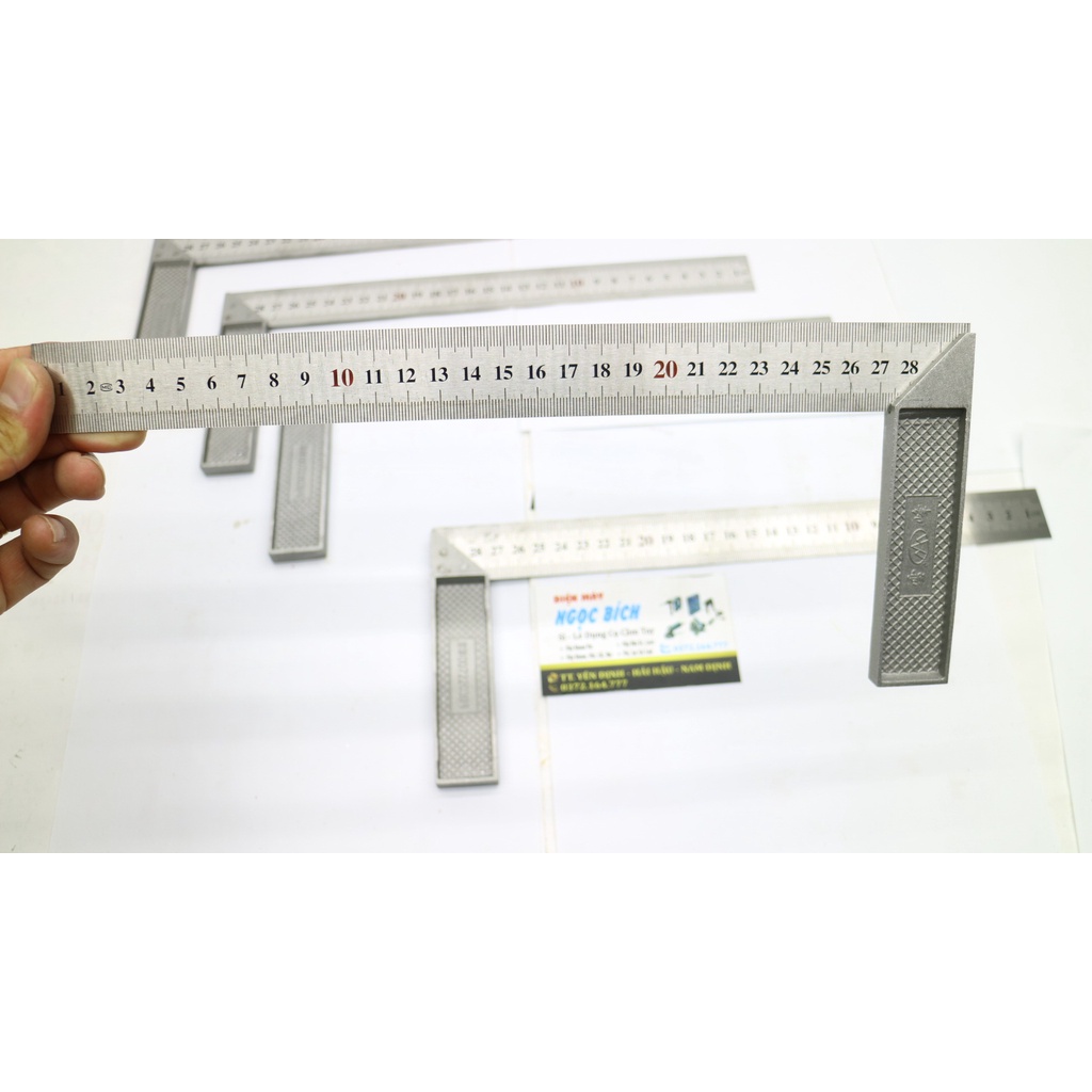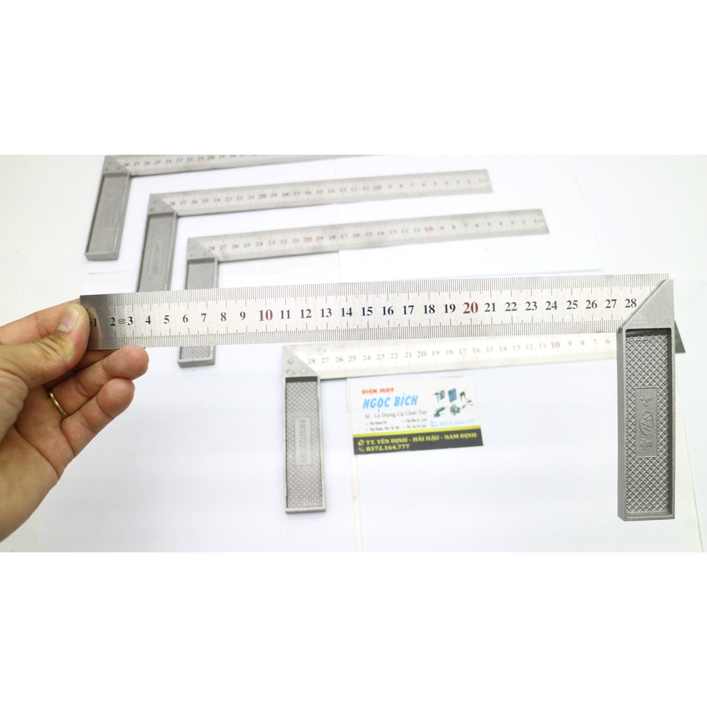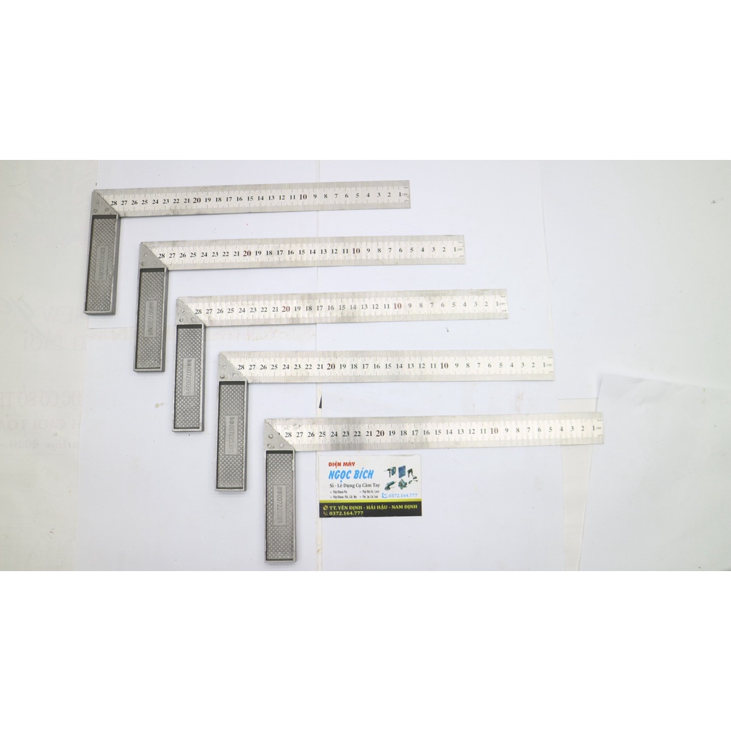 Thước vuông 90 độ là dụng cụ đo đạc đánh dấu không thể thiếu của những người thợ mộc,thợ cơ khí,thợ sắt kỹ nghệ..hay người thợ may. Thước được làm bằng thép chống gỉ,độ đàn hồi tốt chống biến dạng. Tay cầm góc vuông được đúc bằng gang,dập nổi thương hiệu thước. Thước vạch số rõ nét,chính xác. Là dụng cụ đo đạc,đánh dấu của người thợ mộc,thợ cơ khí..Các đặc điểm, thông số kỹ thuật của sản phẩm