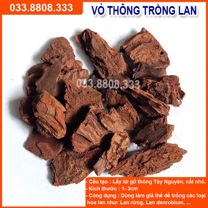 + Làm giá thể trồng lan: Vỏ cây thông là chất trồng hoặc làm giá thể cho cây lan bám rể rất tốt. Do vỏ thông giữ ẩm cao lâu mục, thì cây lan ta trồng sẽ phát triển nhanh và không phải thay giá thể nhiều lần. Vỏ thông có nhiều miếng to, nhỏ, mỏng và dày. Rất dể chọn cho phù hợp với cây lan. Rất phù hợp cho lan dòng hoàng thảo.Vỏ thông kết hợp trồng trong chậu giả gỗ thông thoáng rất thích hợp cho việc trồng lan.