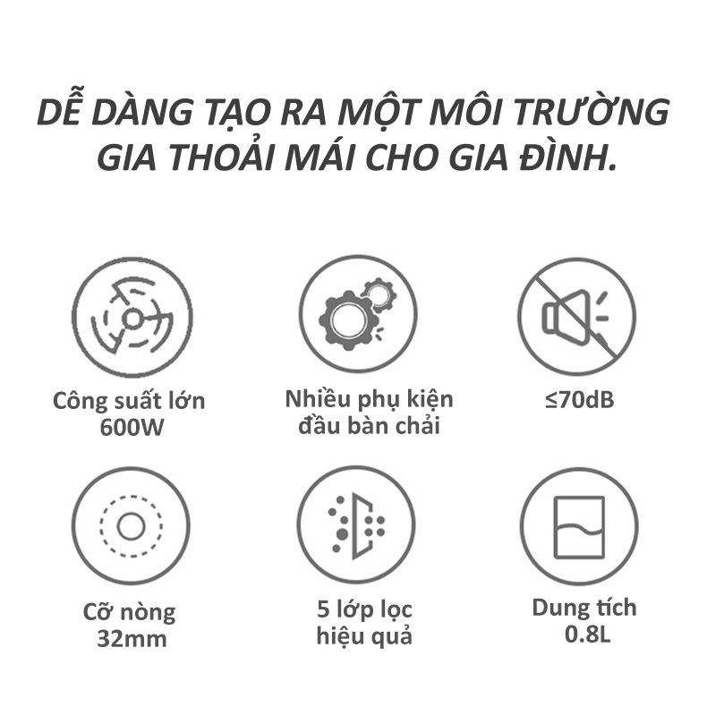 - Tiếng ồn thấp tới 70 decibel, làm sạch nhà một cách lặng lẽ.