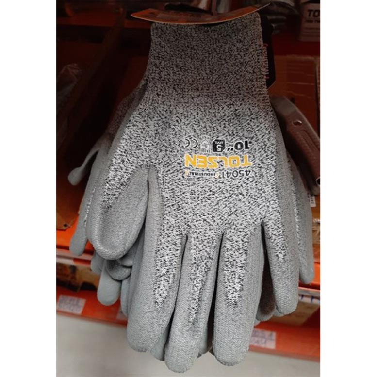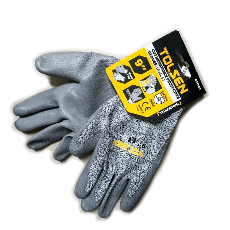 Bao tay vải chống cắt Tolsen được làm từ sợi HPPE liền mạch kết hợp PU tạo sự thoải mái và bảo vệ cắt tuyệt đối cho người dùng.